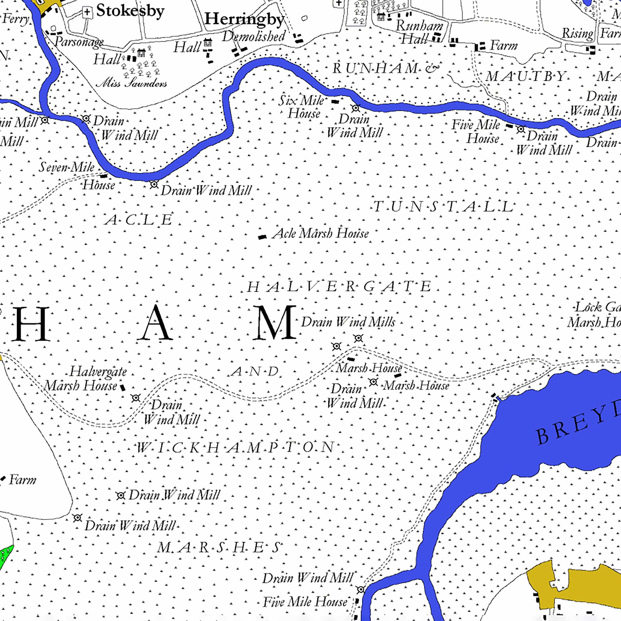 The absence of Acle "New Road" (not built until 1831) and Branch Road (also built in 1831) is clear. The "Drain W.Mill" at the top of the extract is probably Stracey Arms mill. Mutton's mill is shown as "Drain W.Mill" just below the house. Interestingly there is no road or track shown to access the house - access must have been even worse than now!