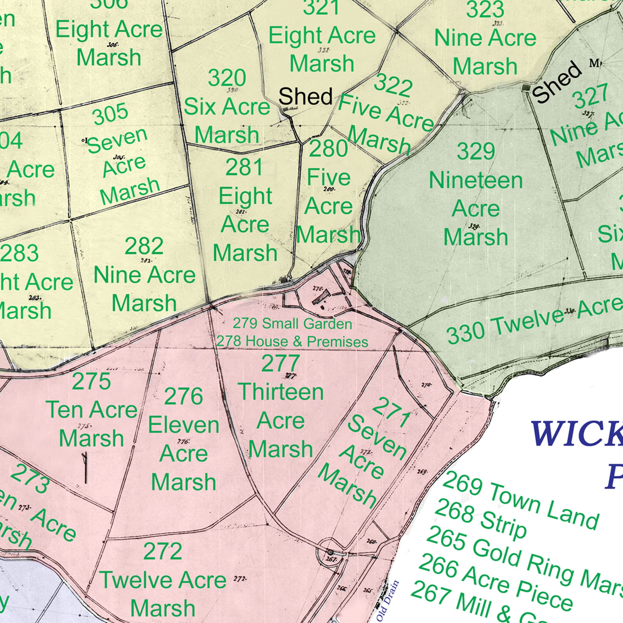 The Acreage in A.R.P is probably Acres, Roods, and Perches. Rood is an English unit of area equal to one quarter of an acre or 10,890 square feet, exactly 1,011.7 m2. A rectangle that is one furlong (i.e., 10 chains, or 40 rods) in length and one rod in width is one rood in area, as is any space comprising 40 perches (a perch being one square rod). So the premises (278) is 4,527.4 SqM (1.12 Acres) and Robin Wood (279) is 556.5 SqM (0.138 acres). So the property as a whole is 2,084 SqM (1.26 acres)